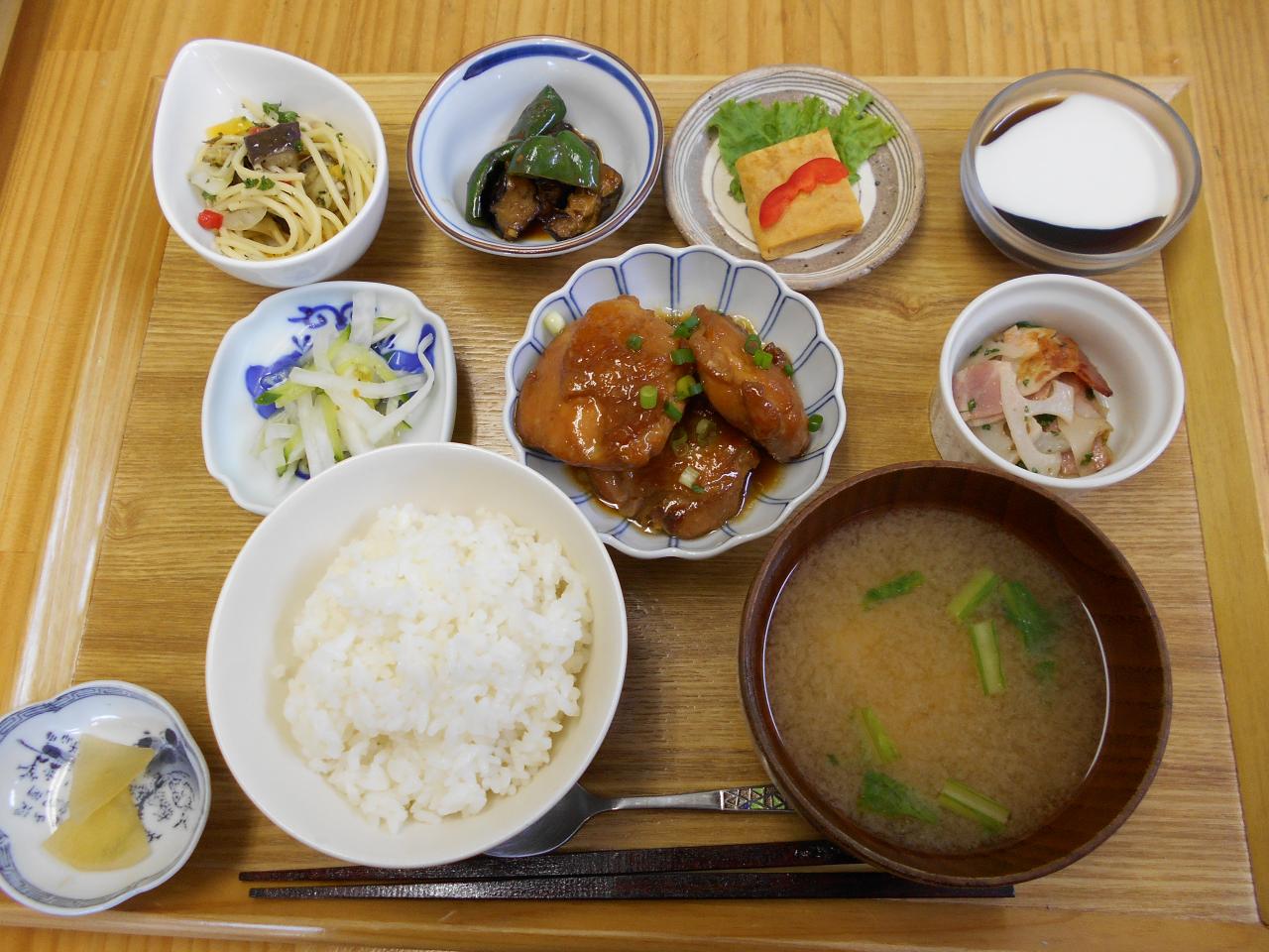 ・鶏肉のさっぱり煮・ナスのみそ炒め・きゅうりと大根の 柚子胡椒風味・パスタサラダ・玉子焼き・レンコンとベーコンの ソテー・コーヒーゼリー