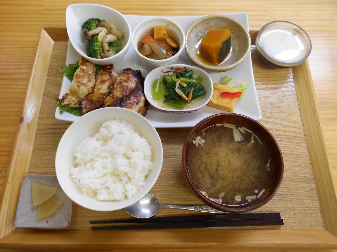 ・焼きギョーザ・小松菜のおひたし・ラタトゥユ・玉子焼き・かぼちゃの煮物・ブロッコリーの ガーリックソテー・コーヒーゼリー