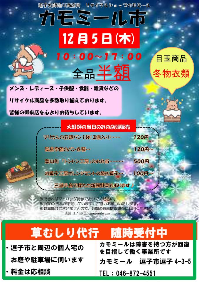 やっと冬らしい寒さになりました🧣🧤 ただ、雨が多くてちょっぴり憂うつになってしまいます☂️ さて、12月5日は今年最後のカモミール市です。 クリスマス用品🎅やお正月用品🎍を中心に、目玉商……