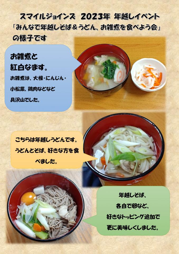 スマイルジョインズ 2023年 年越しイベント 「みんなで年越しそば&うどん、お雑煮を食べよう会」の様子です