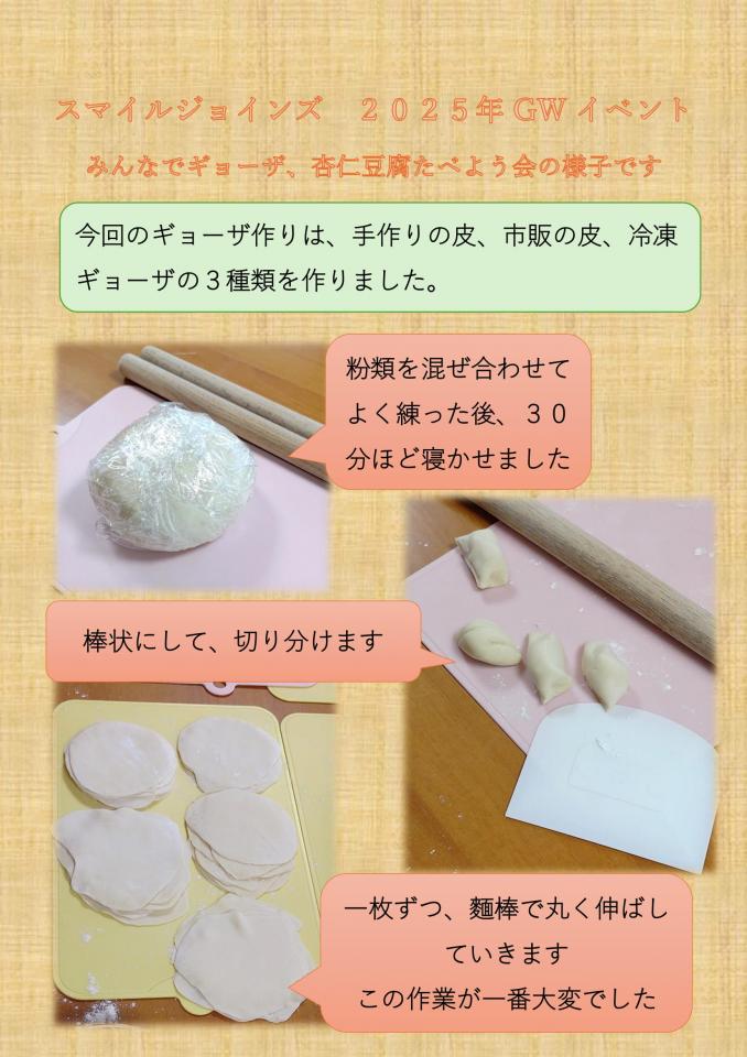 スマイルジョインズ 2025年 GWイベント -みんなで一緒にギョーザ、杏仁豆腐たべよう会- 開催日時 2025年5月3日(土)10:00~15:00 場所 リサイクルショップカモミール(逗……