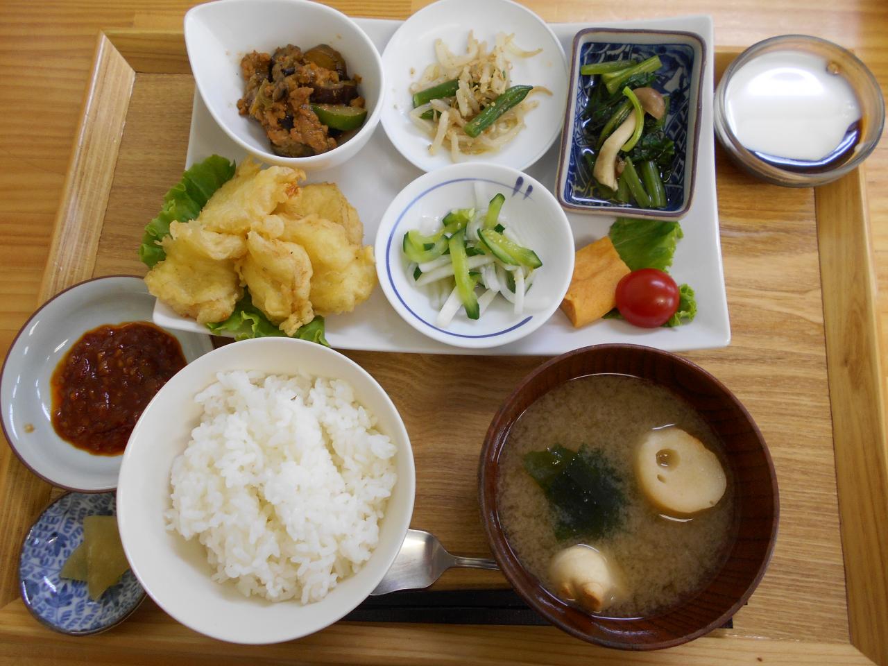 ・白身魚の天ぷら チリソース添え・もやしのナムル・玉子焼き・小松菜のおひたし・夏野菜のミートソース和え・大根と大葉の甘酢和え・コーヒーゼリー