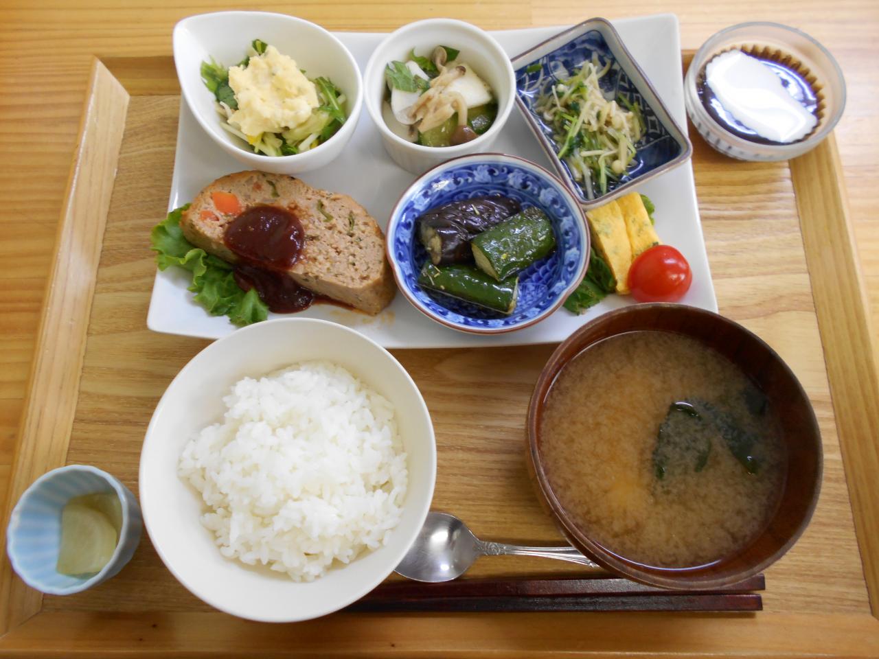 ・ミートローフ・ナスとズッキーニのソテー・玉子焼き・豆苗のおひたし・キャベツと水菜のサラダ・カブと胡瓜の大葉風味・コーヒーゼリー