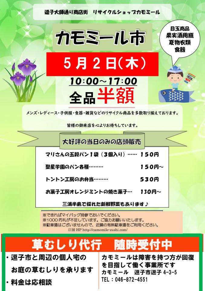 スマイルジョインズ 2024年 GWイベント -粉づくし、粉まみれ、粉もの大会- 開催日時 5月6日(月・祝)10:30~15:00 場所 リサイクルショップカモミール(逗子市逗子4丁目3−……