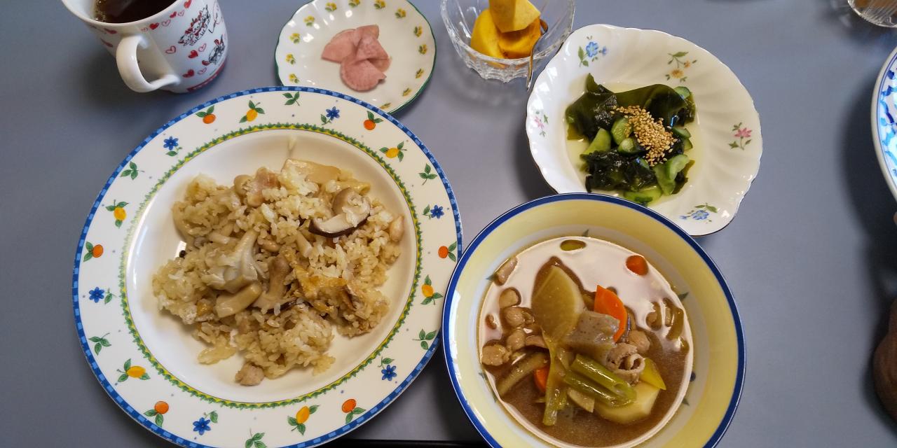 今日の給食です🍽️ キノコの炊き込みご飯と豚汁がメインでした☺️ 日暮れが早くなったり、風が涼しく感じたりと、体感では秋を感じていましたが、目と舌でも秋を楽しめました。 和食って良いなぁ☺️……