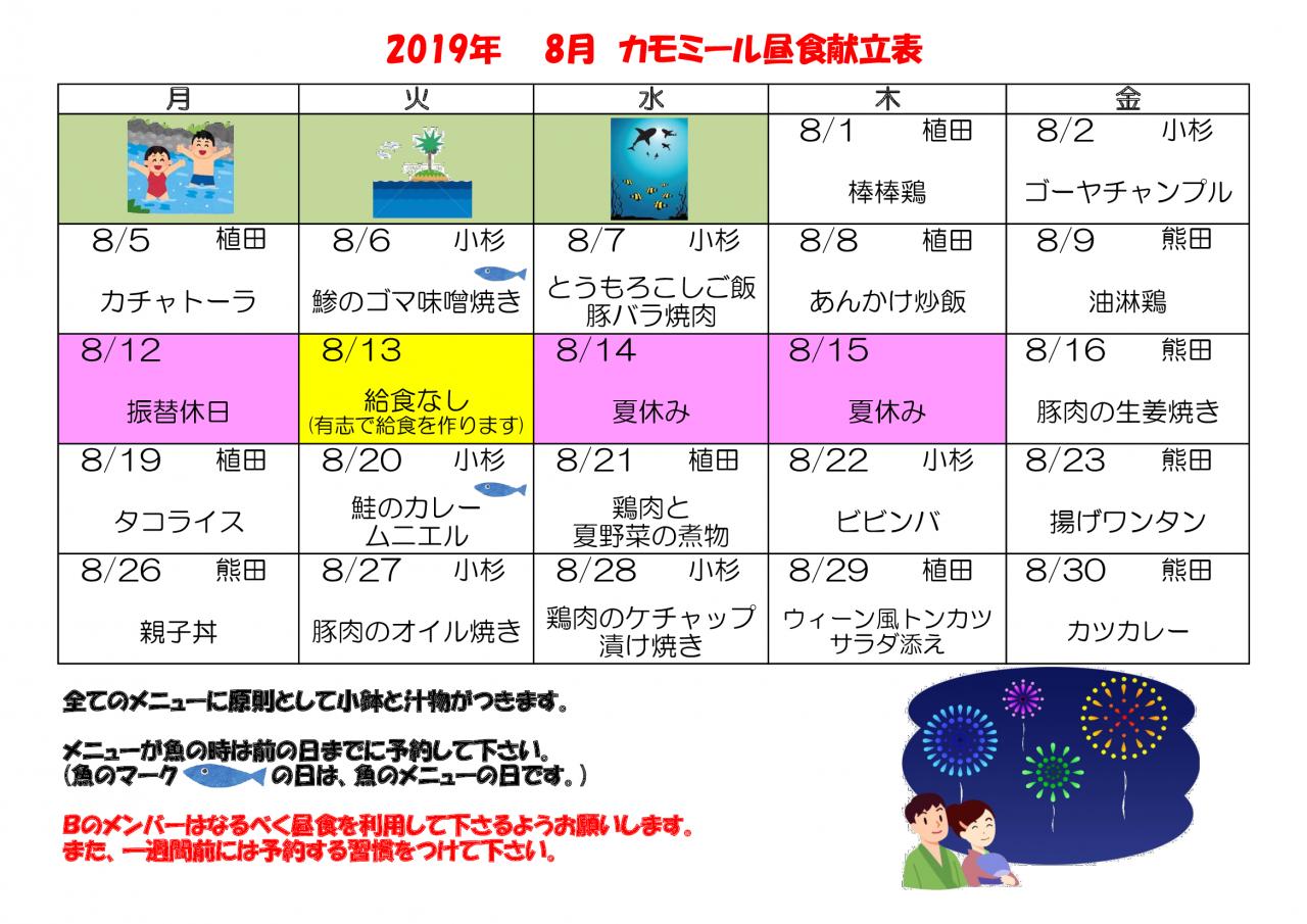 2019年 8月昼食献立表