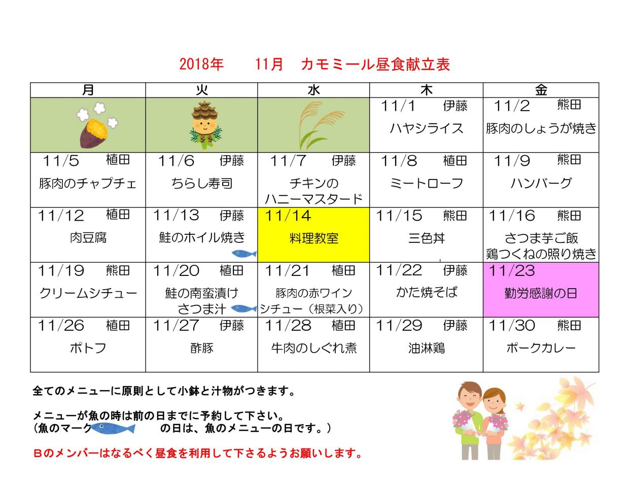 • カモミール 11月昼食献立表